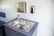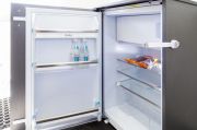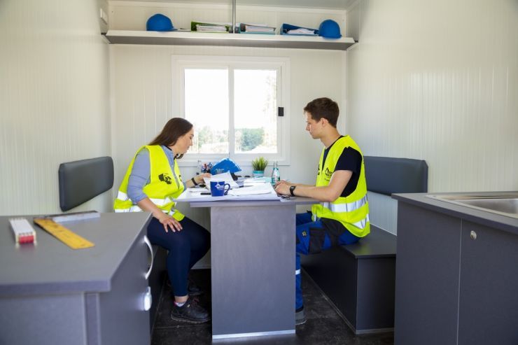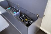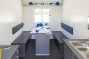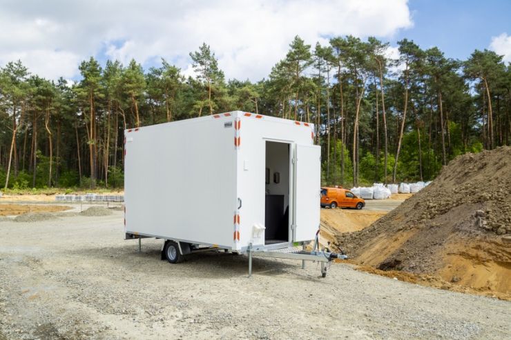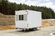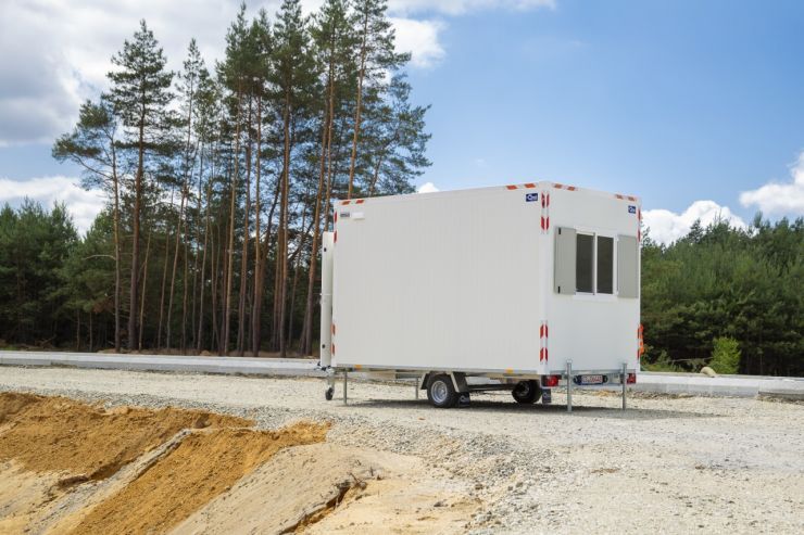Ideal geeignet für Baustellen als Sozialraum, Büro, Umkleideraum, Bürowagen mit Sanitärbereich oder Werkzeuglager. Eine auf die Bedürfnisse der Kunden abgestimmte Ausstattung ermöglicht es, einen komfortablen Raum zu schaffen. In diesem Anhänger ist die Möglichkeit, sowohl einen Kühlschrank als auch Elektrogeräte zu platzieren, und ein bequemes Waschbecken bietet ständigen Zugang zu frischem Wasser. Nicht nur die Multifunktionalität dieses Anhängers ist sein Vorteil, sondern auch die individuell gestalteten Möbel, die sowohl als Lagerplatz als auch als Sitzgelegenheit genutzt werden können. Zusätzlich bieten die Schiebefenster mit Klappen Schutz vor Regen, Schnee oder zu starker Sonne.