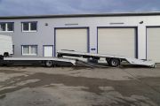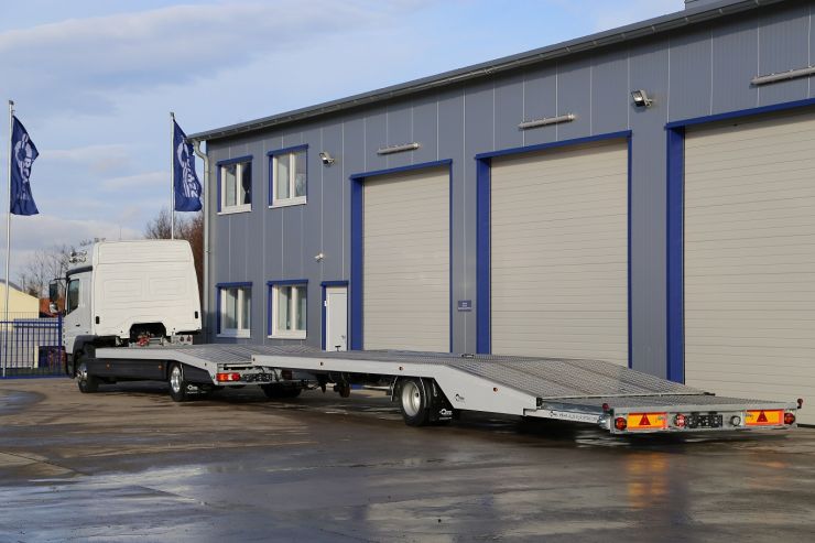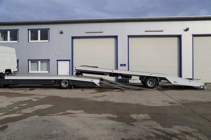 Die Fahrzeugtransport- Aufbauten sind auf speziellen Wunsch unserer Kunden gefertigt. Deshalb sind sie innovativ und einzigartig. So ist auch der Fahrzeugtransport- Aufbau mit dem pneumatisch gebremsten Anhänger. Dadurch hat der komplette Zug eine maximale Ladeflächenlänge von ca. 16 m. Zusätzlich hat der Anhänger einen pneumatisch ausfahrbaren Heckausschub, der die Plattform um ca. 150cm verlängern kann. Dank solcher Lösung kann man nicht nur die Ladefläche verlängern sondern auch den Auffahrwinkel verkleinern.