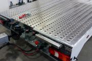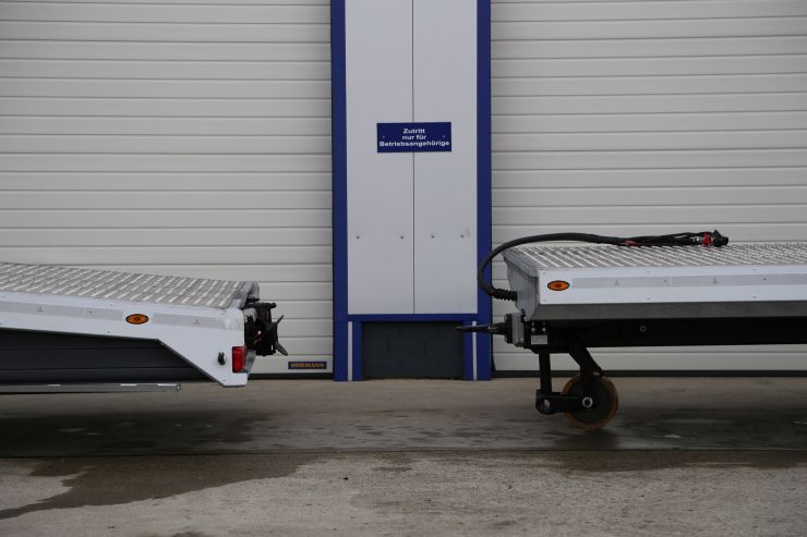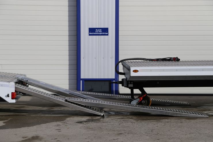 Durch die Verwendung von Aluminium- Auffahrschienen beim Anhänger, sowie auch bei den Fahrzeugtransport- Aufbauten haben diese ein geringeres Leergewicht. Des weiteren besteht die Ladefläche aus Alu- Lochblech und Alu- Riffelblech. Man muss noch unterstreichen, dass die Alu-Auffahrschienen im Gegensatz zu Stahl-Auffahrschienen eine größere Widerstandsfähigkeit gegenüber atmosphärischen Bedingungen haben.