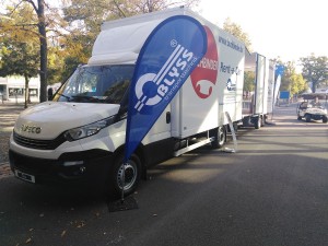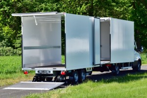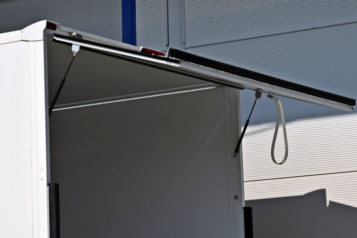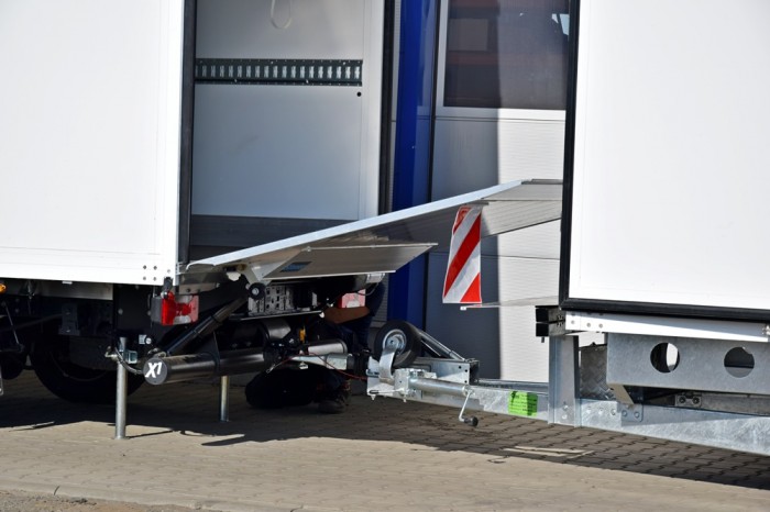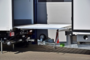 Die Flügeltüren des Anhängers und die Heckklappe des Aufbaus sind so konzipiert, dass ein ebener Ladeboden entsteht, der mit einem Hubwagen überfahren werden kann.