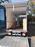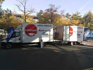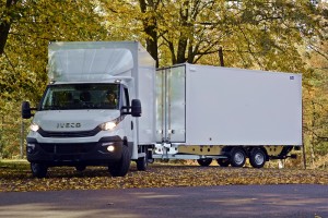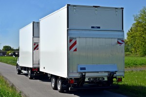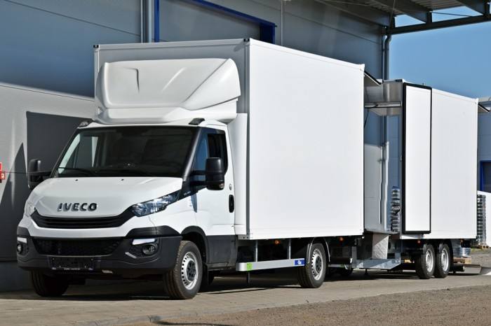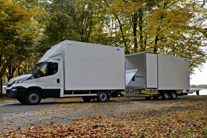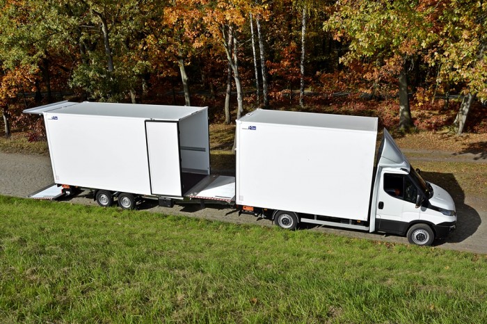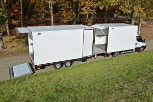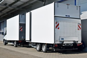 Ein Durchladezug, bestehend aus einem Leichtbau-Kofferaufbau auf einem 3,5t Transporterfahrgestell und einem Zentralachs-Kofferanhänger, der über die als „Brücke“ fungierende Ladebordwandplattform und vordere Türen am Anhänger schnell und in einem Ablauf be- oder entladen werden kann.
