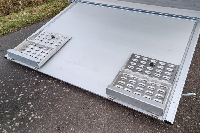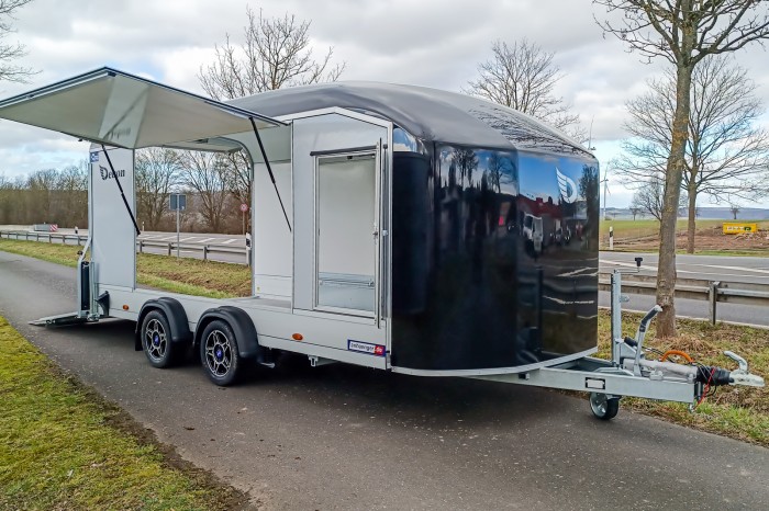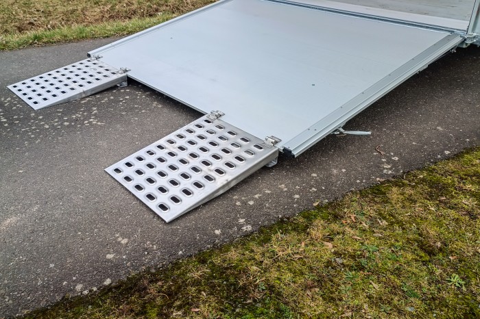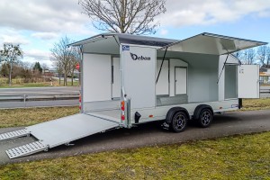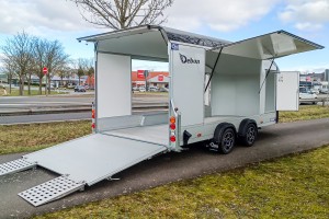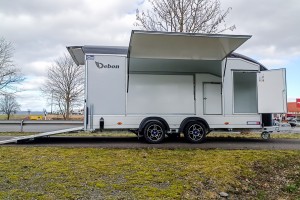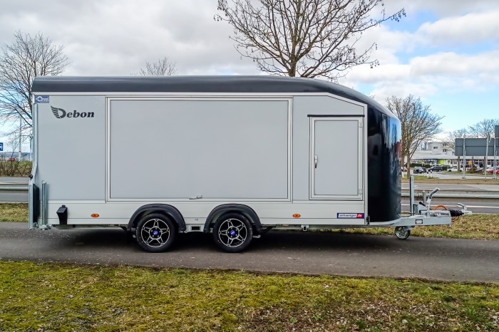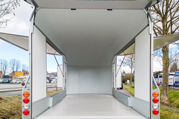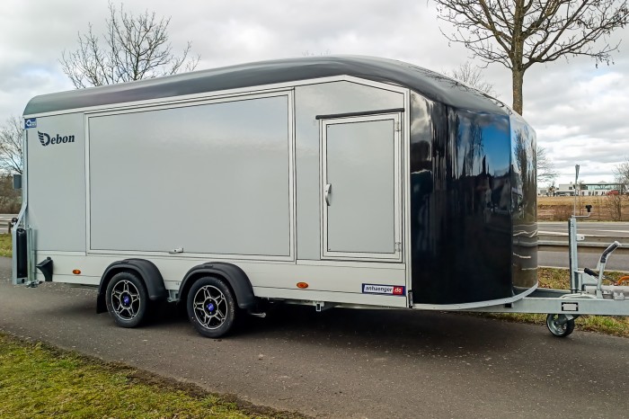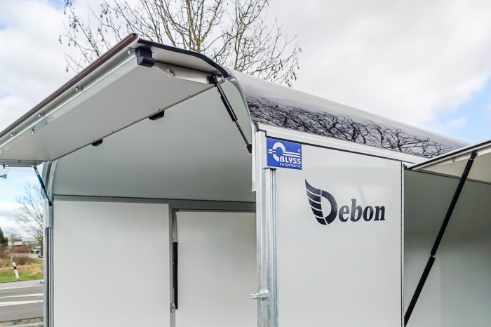 Abbildungen müssen nicht der Standard-Ausstattung entsprechen, technische Änderungen (z.B. Reifengrößen) vorbehalten. Technische DatenAnhängertyp | Debon Roadster 1000 | Gesamtgewicht | 3500kg | Nutzlast | 2535kg | Innenmaße | L: 497cm, B: 202cm, H: 206cm | Außenmaße | L: 625cm, B: 235cm, H: 236cm | Ladehöhe | ca. 30cm | Boden | Alupaneele mit Antirutschriffelung; Bugrundung Boden Stahl | Verzurrpunkte | 8 Zurrösen innen | Elektrik | 12V - Stecker 13 polig - Rückfahrleuchte | Reifen | 195/50R13C | Achsenhersteller | AL-KO oder KNOTT | Anzahl der Achsen | 2 | Gebremste Achse | Ja | Stützrad serienmäßig | zentral montiertes Automatikstützrad mit Rangiergriff | Seitenwände | Sandwich | Poly-Front-Dach Kombination | in aerodynamischer Form | Seitentür | x 2, vorne | Heckrampe | mit ausklappbaren Verlängerungsrampen | Klappe mit Gasdruckfedern | x 2 | Pullmann-Fahrwerk | mit Schraubenfedern und Stoßdämpfern (100 km/h Bescheinigung ab Werk) | Auflaufeinrichtung | mit Rückfahrautomatik und Feststellbremse | Heckrampe | Aluminium rutschhemmend innen, mit Gashebern | Tragkraft der Rampe | 1000 kg | Einzel-Kotflügel | Kunststoff | Rückleuchten | geschützt in Seitenstreben montiert |