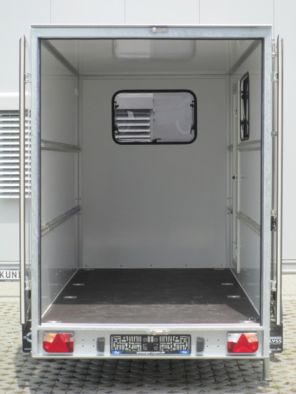 Technische DatenAnhängertyp | F1336/190HL | Gesamtgewicht | 1300kg | Nutzlast | 640kg | Innenmaße | L: 358cm, B: 146cm, H: 190cm | Außenmaße | L: 505cm, B: 198cm, H: 245cm | Ladehöhe | 50cm | Boden | Multiplex-Holzboden | Verzurrpunkte | je Seite 4 | Rahmen | Stahlrahmen geschweißt,komplett Tauchbad feuerverzinkt | Reifen | 165R13C | Achsenhersteller | AL-KO oder KNOTT | Anzahl der Achsen | 1 | Gebremste Achse | Ja | Stützrad serienmäßig | Ja | Zurrleisten | je Seite 2 | Tür-Lademaß | B: 142cm, H: 184cm | Doppelflügeltür | mit Drehstangenverschluss, abschließbar | Unterlegkeile | 2 | Wände | Sandwichwände 25 mm | Seitenwandlüfter | je Seite 1 | Stecker | 13-polig, 12V | Heckstützen | Ja | Stoßdämpferfahrwerk | Ja + 100km/h Zulassung | Seitentür | vorne rechts in Fahrtrichtung | Fenster 80 cm x 50 cm Schwarz | rechts in Fahrtrichtung | Fenster 80 cm x 50 cm Schwarz | in der Front |