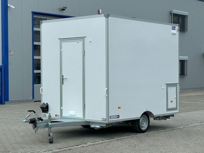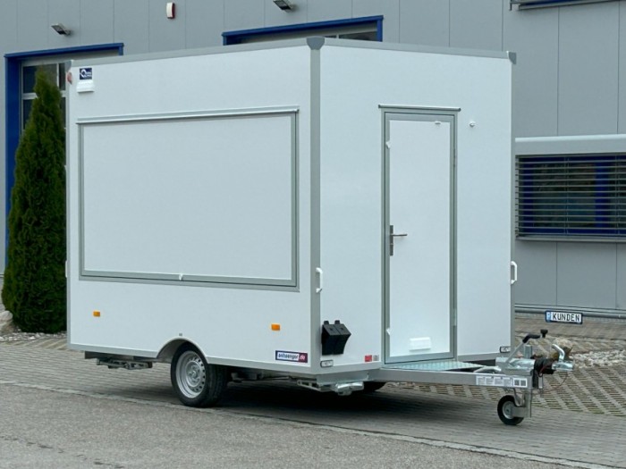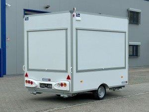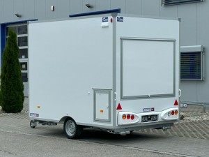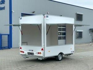 Technische DatenAnhängertyp | H13302HL Verkaufswagen | Gesamtgewicht | 1300kg | Nutzlast | 570kg | Innenmaße | L: 300cm, B: 200cm, H: 230cm | Boden | Trittfester PVC Fußboden | Rahmen | Tauchbad feuerverzinkt | Elektrik | 13-Polig, 12V | Reifen | 165R13C | Achsenhersteller | AL-KO oder KNOTT | Anzahl der Achsen | 1 | Gebremste Achse | Ja | Stützrad serienmäßig | Ja | Auflaufbremse | mechanisch, mit Rückfahrautomatik | Buglaufrad | höhenverstellbar | Ausdrehstützen | 4, verzinkt | serienmäßig Seitenwandlüfter | Ja | Kofferaufbau | vollisoliert | Außenbeplankung | Laminatwände, glatt | Verkaufsklappen | 2 mit Gasfederstützen und Zusatzsicherung | Eingangstüre | in der Vorderwand | Sicherheitsschloss | Ja + 2 Schlüssel | Stoßdämpferfahrwerk | + 100km/h Bestätigung | Innenverkleidung und Außenverkleidung | in weiß beschichtet |