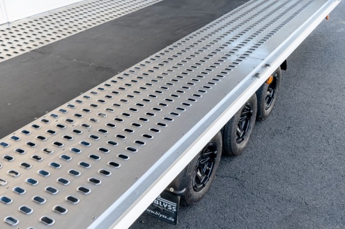 Technische DatenAnhängertyp | Monte Carlo 600 deluxe | Gesamtgewicht | 3500kg | Nutzlast | 1710kg | Innenmaße | L: 600cm, B: 230cm, H: 200cm | Außenmaße | L: 786cm, B: 245cm, H: 370cm | Ladehöhe | ca. 58cm | Boden | Alu- Lochblech- Standschienen außen B = 75 cm, 6 - Loch- System, in der Mitte Multiplex- Holz- Boden | Verzurrpunkte | Lochblech | Rahmen | Stahl geschweißt, Tauchbad feuerverzinkt | Elektrik | 13-polig, 12V | Reifen | 195/55R10C + schwarze Alufelgen | Achsenhersteller | AL-KO oder KNOTT | Anzahl der Achsen | 3 | Gebremste Achse | Ja | Stützrad serienmäßig | Ja | Hydraulisch | kippbar | Dachreling | Ja | überfahrbare Heckklappe | + Alu Auffahrschienen | Stoßdämpferfahrwerk | + 100km/h Zulassung | Wände | Sandwich | Tür-Lademaß | B: 220 cm / H: 197 cm | Aerodynamik | Ja | Fenster | mit Doppelrollos in der Bugwand | elektrische Seilwinde | seitlich verschiebbar | Flügeltür | rechts und links | Ladeboden | Alu- Lochblech- Standschienen rechts und links von unten mit Alublech verkleiden |