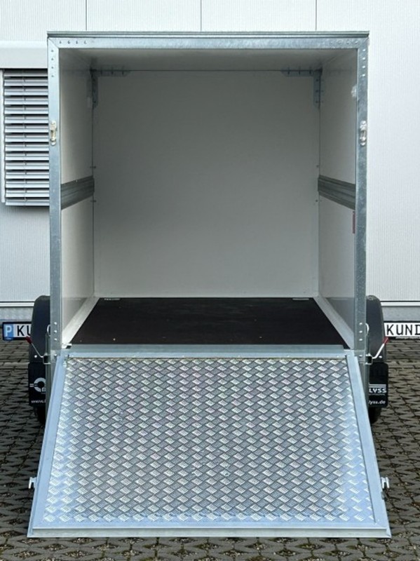 Technische Daten| Anhängertyp | FR1326/150HL Heckklappe | | Gesamtgewicht | 1300kg | | Nutzlast | 835kg | | Innenmaße | L: 262cm, B: 150cm, H: 150cm | | Außenmaße | L: 381cm, B: 197cm, H:210cm | | Ladehöhe | 56cm | | Boden | Multiplex-Holzboden | | Verzurrpunkte | je Seite 2 | | Bordwände | Sandwich | | Rahmen | Stahlrahmen geschweißt, komplett Tauchbad feuerverzinkt | | Elektrik | 13-Polig, 12V | | Reifen | 165R13C | | Achsenhersteller | AL-KO oder KNOTT | | Anzahl der Achsen | 1 | | Gebremste Achse | Ja | | Stützrad serienmäßig | Ja | | Tür-Lademaß | B: 145cm, H:146cm | | Überfahrbare Heckklappe | mit Drehstangenverschluss, abschließbar | | Zurrleisten | je Seite 1 | | Heckstützen | Ja | | Unterlegkeile | 2 | | Stoßdämpferfahrwerk | Ja + 100km/h Zulassung | | Seitenwandlüfter | je Seite 1 |