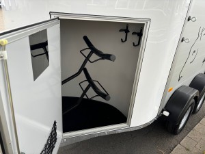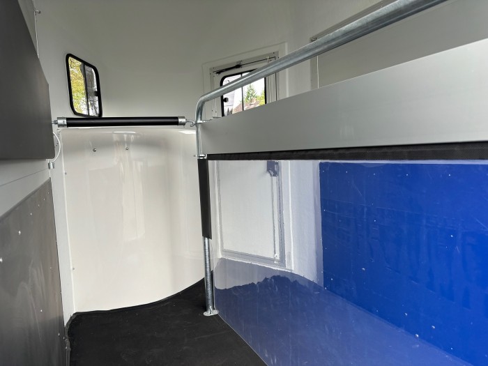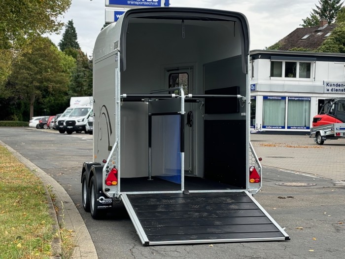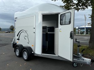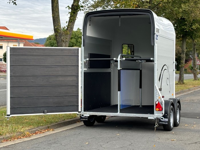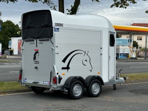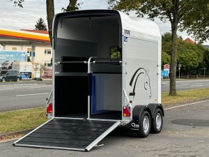 Technische DatenAnhängertyp | Gold Origins Alu | Gesamtgewicht | 2000kg | Nutzlast | 1300kg | Innenmaße | ca. L: 328cm, B: 167cm, H: 230cm | Außenmaße | ca. L: 451cm, B: 215cm, H: 265cm | Elektrik | 13 polig / mit Rückfahrscheinwerfer | Reifen | 185/70R13 | Gebremste Achse | Serie | Anzahl der Achsen | 2 | Rahmen | massives feuerverzinktes Rahmenprofil | Boden | Aluminium | Stützrad serienmäßig | Automatikstützrad | Aufbau | Eloxierte Aluminium Wände | Haube | Polyesterhaube mit Verstärkung | Aufstellfenster | 2 Getönte und vergitterte Aufstellfenster | Stoßdämpferfahrwerk | Ja | Heckrampe | Heckklappe dreh und schwenkbar mit Planenrollo oben | Sattelkammer | Ja | Einstiegstür | rechts | Panikentriegelung | Ja | Trittschutz und Seitenpolsterung | Ja | 4 Verstellbare Boxenstangen | mit Mitteltrennwand | Innenlicht | mit Schalter |